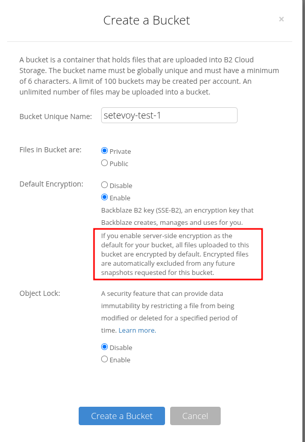 Створимо тестовий бакет – звертаємо увагу на попередження про шифрування: