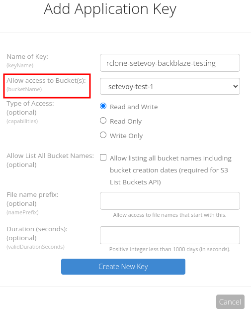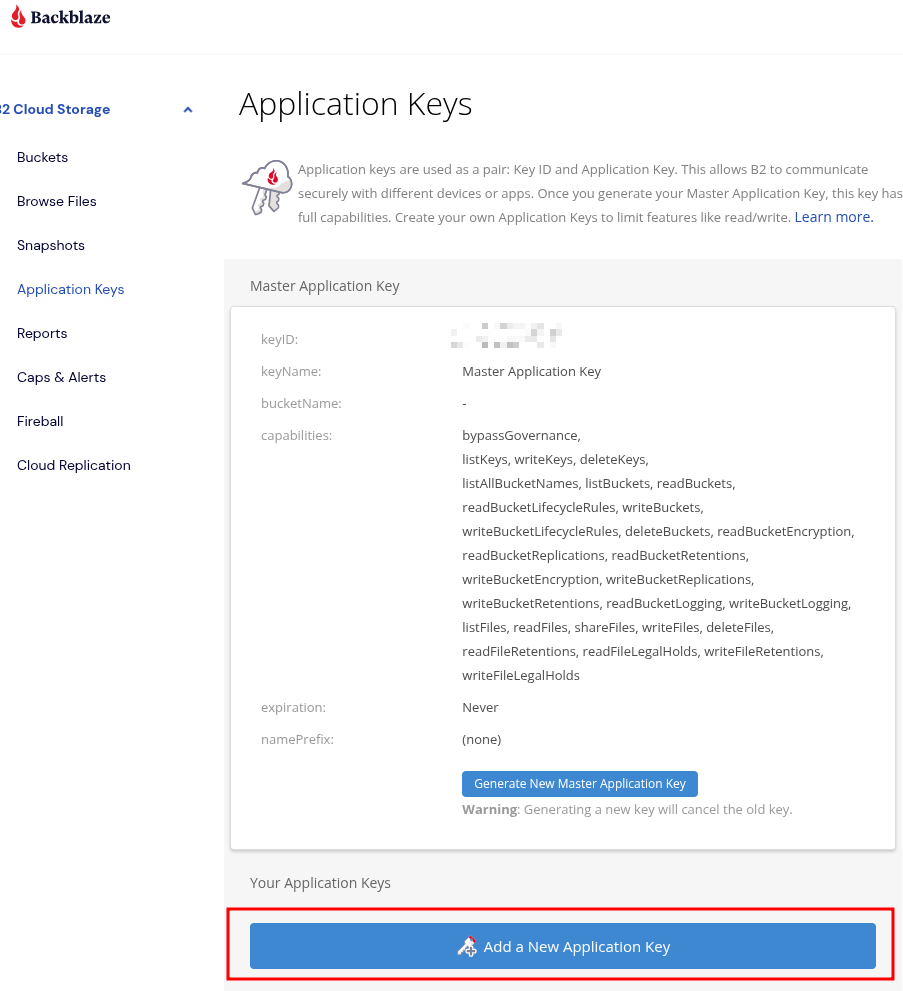 В моєму кейсі працювати з Backblaze буде Rclone, тому для нього створимо окремий ключик, див. Create and Manage App Keys: