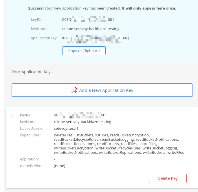 $ rclone config ... e) Edit existing remote n) New remote d) Delete remote ... Enter name for new remote. name> setevoy-backblaze-testing ... Option Storage. Type of storage to configure. Choose a number from below, or type in your own value. ... 5 / Backblaze B2 \ (b2) ... Account ID or Application Key ID. Enter a value. account> 003***001 ... Application Key. Enter a value. key> K00***MXQ ... Option hard_delete. Permanently delete files on remote removal, otherwise hide files. Enter a boolean value (true or false). Press Enter for the default (false). hard_delete> Edit advanced config? y) Yes n) No (default) y/n> Configuration complete. Options: - type: b2 - account: 003f07593a16f1d0000000001 - key: K003+sr5NBQhJvsTdlCnfdt9UYHqMXQ Keep this "setevoy-backblaze-testing" remote? y) Yes this is OK (default) ...