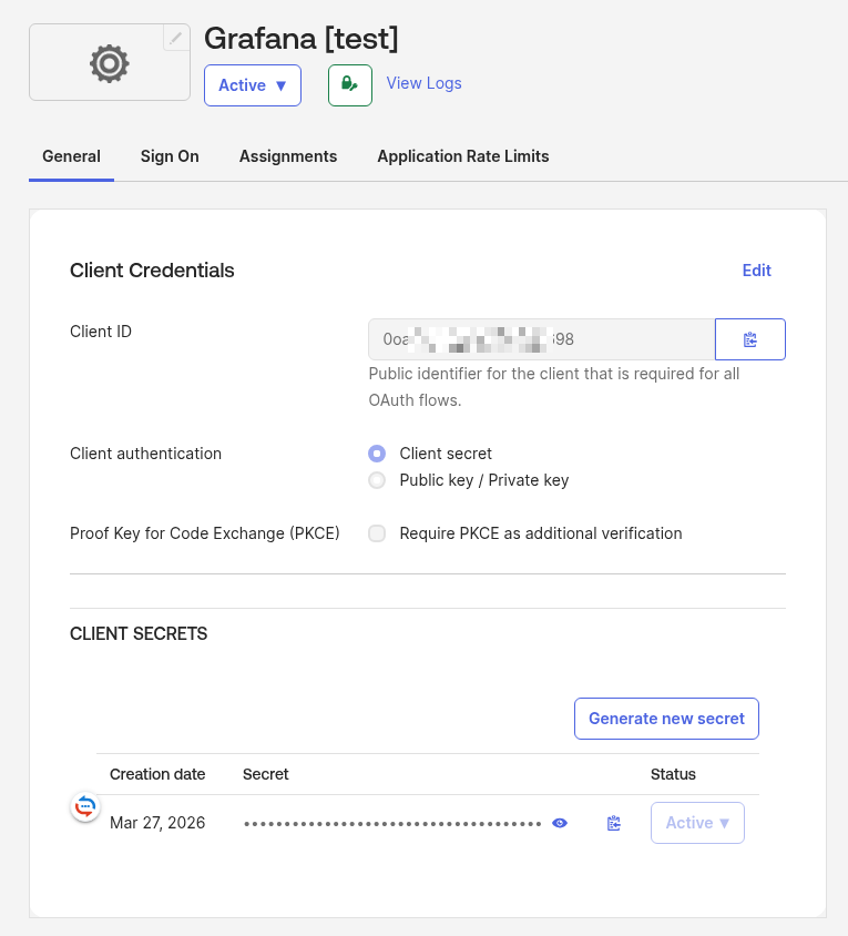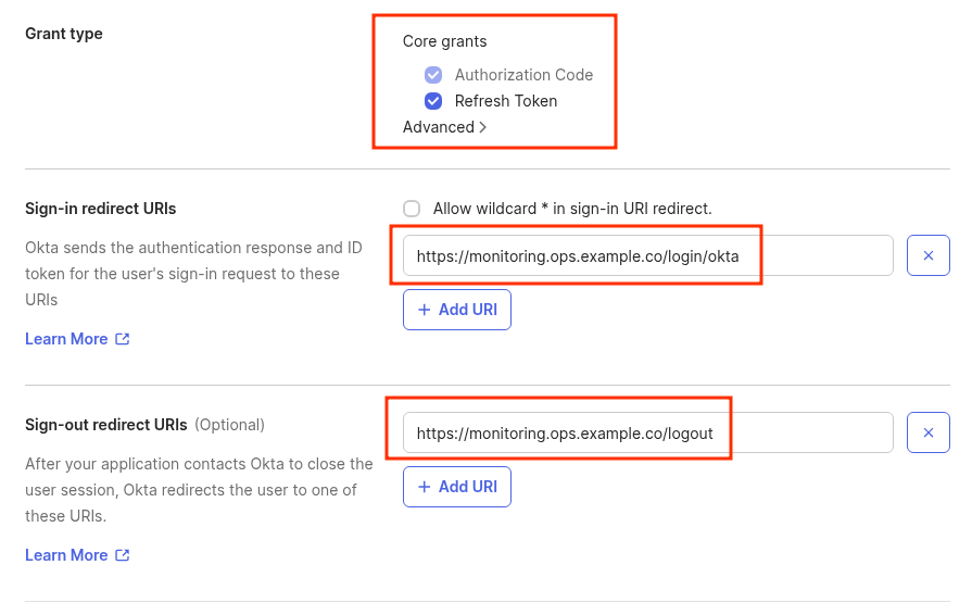 In URLs set the endpoints specified in the documentation – https://<grafana_url>/login/okta and https://<grafana_url>/logout: