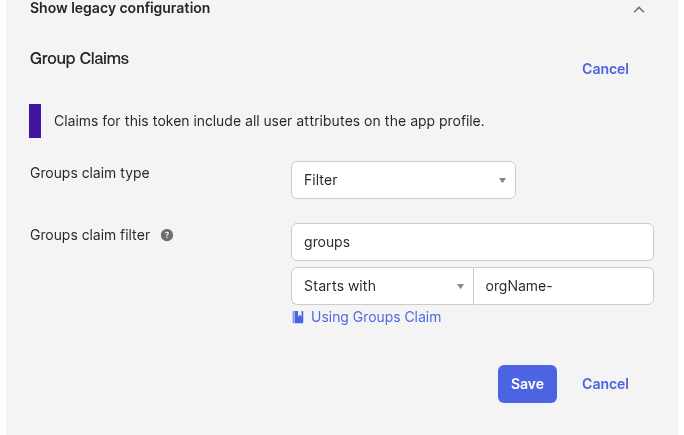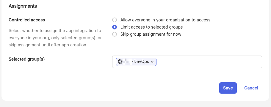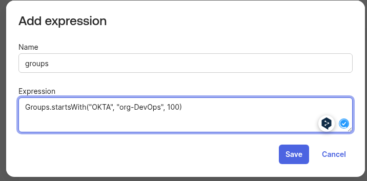 Where “OKTA” is the group source, and “org-DevOps” is a filter to only pass the group when its name starts with “org-DevOps“: