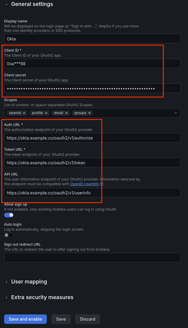 - Auth URL: https://okta.example.com/oauth2/v1/authorize