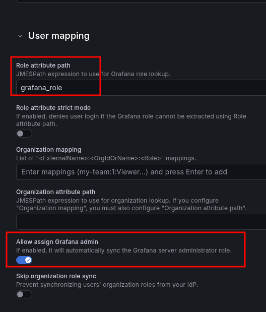 Now for the roles: if we’re passing the role via App Profile and Custom Attribute – set the “Role attribute path” field in User mapping simply to grafana_role: