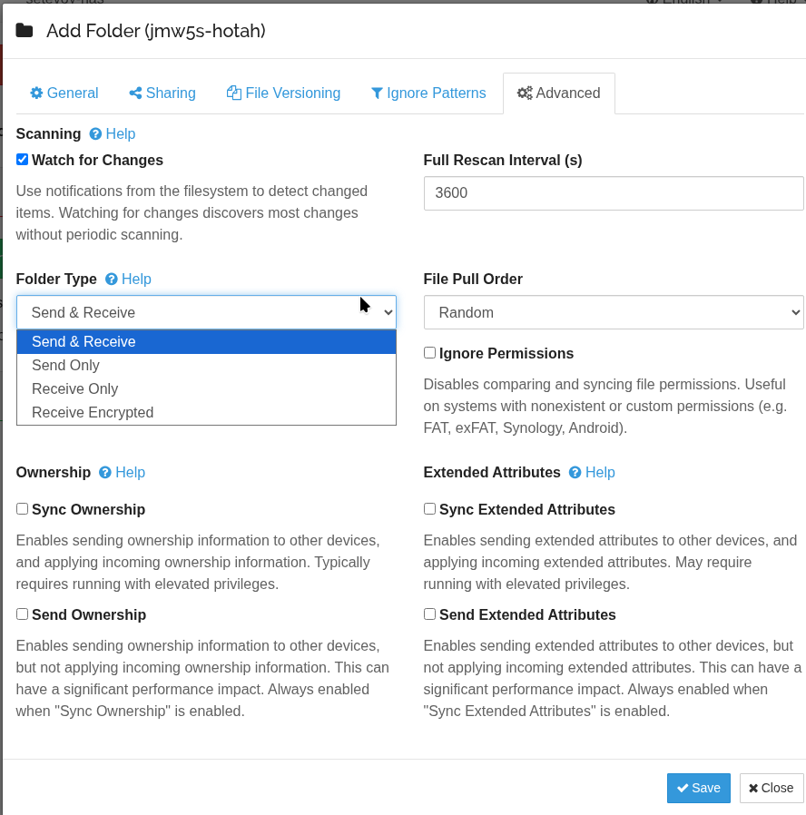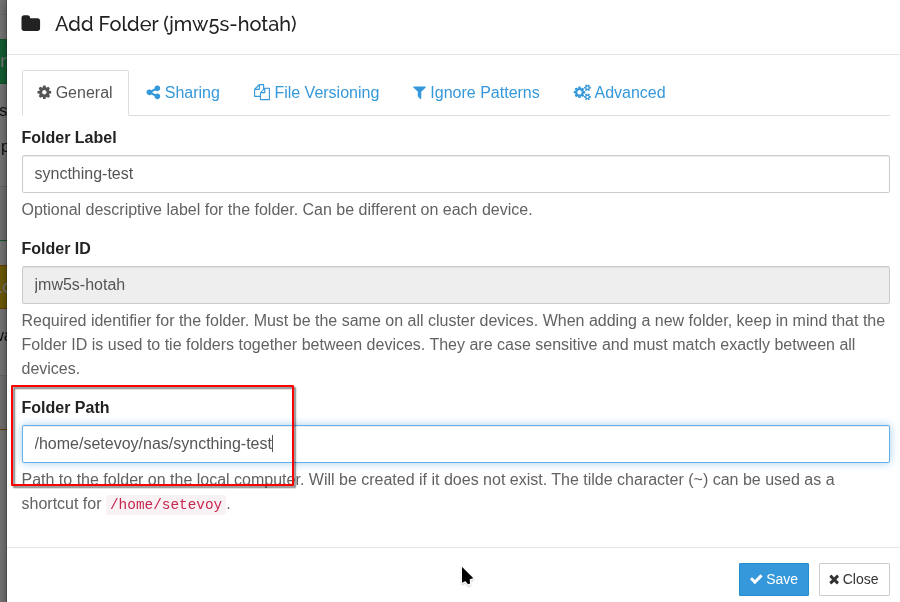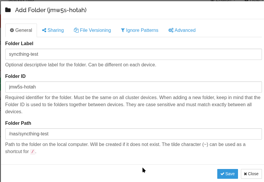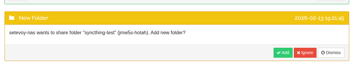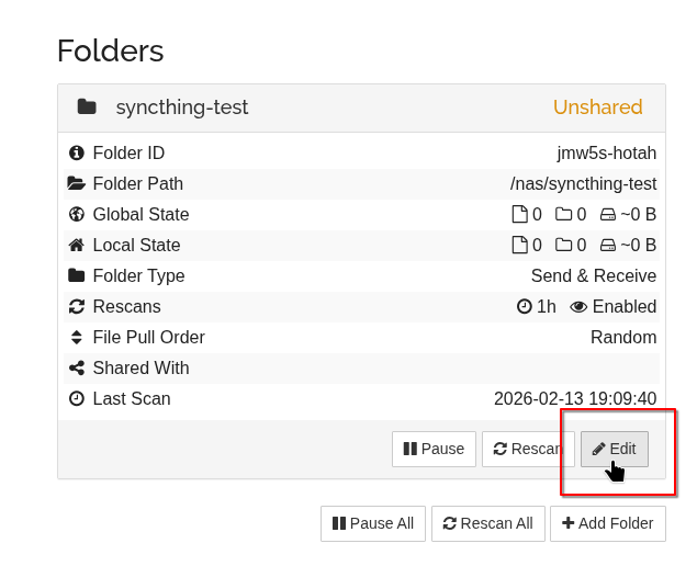 <folder id="jmw5s-hotah" label="syncthing-test" path="/nas/syncthing-test" type="sendreceive" rescanIntervalS="3600" fsWatcherEnabled="true" fsWatcherDelayS="10" fsWatcherTimeoutS="0" ignorePerms="false" autoNormalize="true">