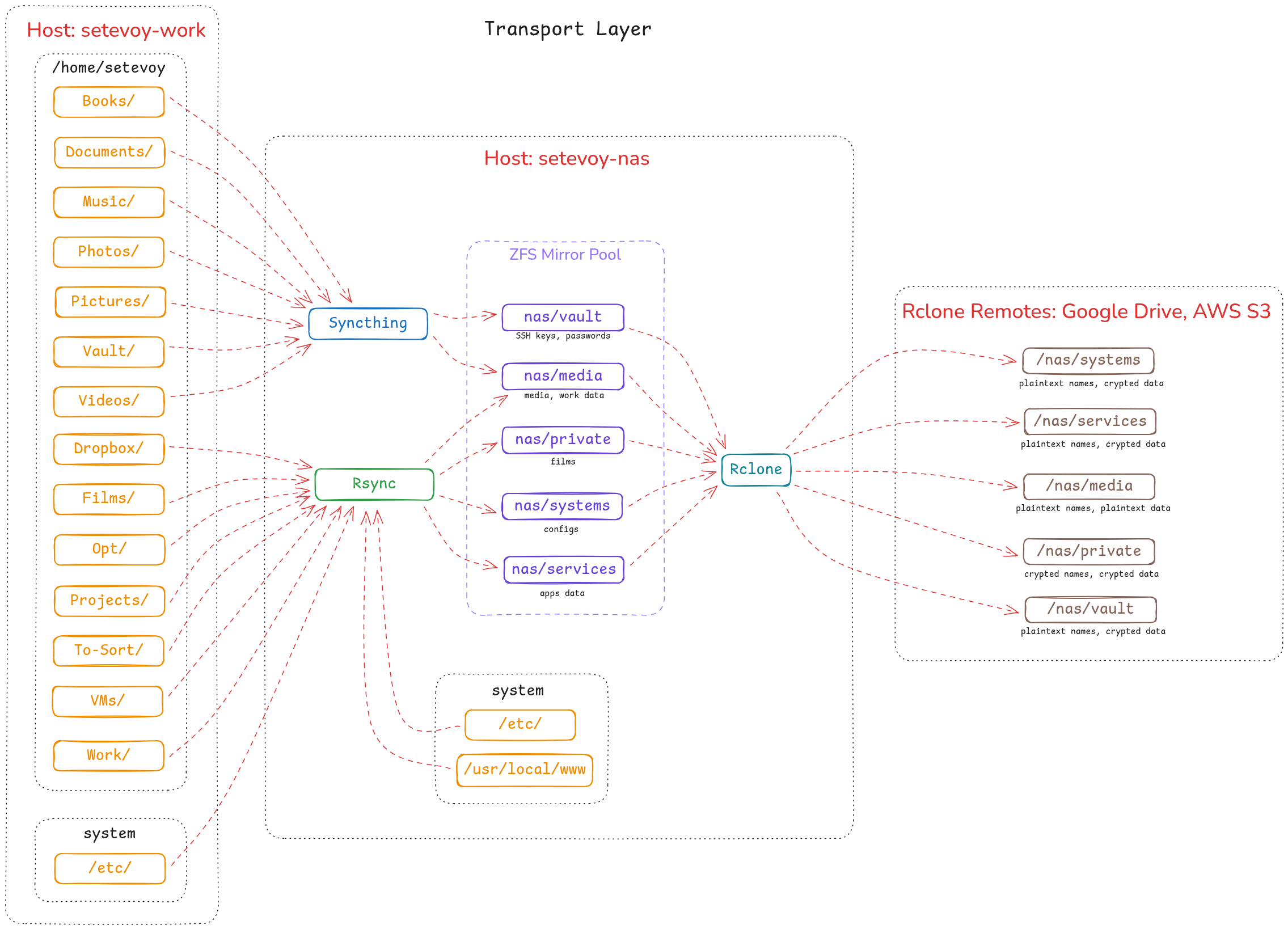 Трохи забігаючи наперед (бо схема с наступного поста FreeBSD: Hone NAS, part 12: планування бекапів) – роль Syncthing в моєму сетапі виглядає так: