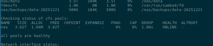 root@setevoy-nas:/home/setevoy # zpool history History for 'nas': 2025-12-19.13:37:17 zpool create -o ashift=12 -O atime=off -O compression=lz4 -O xattr=sa nas mirror /dev/gpt/zfs_disk1 /dev/gpt/zfs_disk2 2025-12-19.13:41:00 zfs create nas/data 2025-12-19.13:44:19 zfs create nas/backups 2025-12-19.13:48:44 zfs create -o encryption=on -o keyformat=passphrase -o keylocation=prompt nas/private ... 2025-12-21.17:26:30 zfs snapshot -r nas/data@daily-2025-12-21_17.26.30--1w