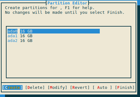 Встановлювати систему будемо на ada0, вибираємо його і Create: