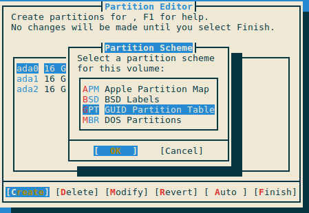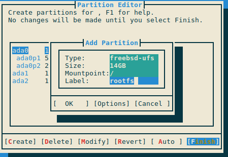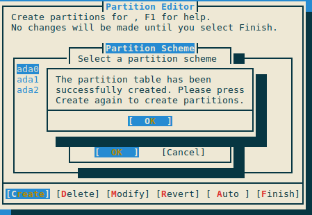 Підтверджуємо зміни, і маємо нову partition table на системному ada0: