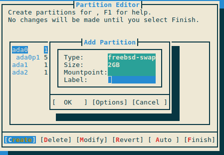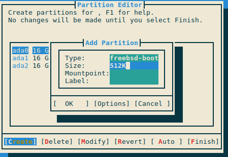 Ще раз вибираємо ada0, Create, і створюємо розділ під freebsd-boot.