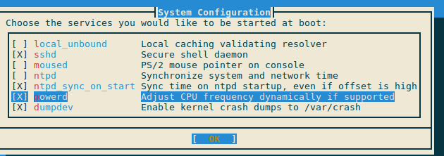 В System Configuration – sshd, без мишки, включаємо ntpd і powerd: