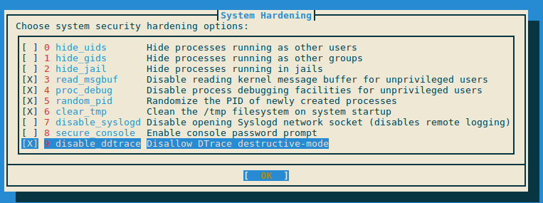 read_msgbuf: дозволяємоdmesgтільки rootproc_debug: дозволяємоptraceтільки rootrandom_pid: номера PID в більш рандомному порядкуclear_tmp: чистимо/tmpпри ребутахsecure_console: вимагаємо парольrootпри логіні з фізичної консолі