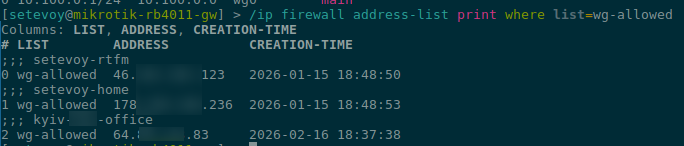 /ip firewall address-list add list=wg-allowed address=178.***.236 comment=setevoy-home