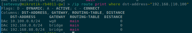 MikroTik автоматично створює dynamic connected route для мережі WireGuard (10.100.0.0/24) після створення інтерфейсу wg0, і вже має routes для своїх локальних мереж, які безпосередньо підключені до його інтерфейсів (bridge, ether):