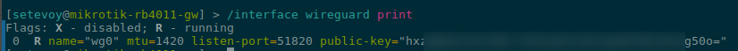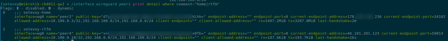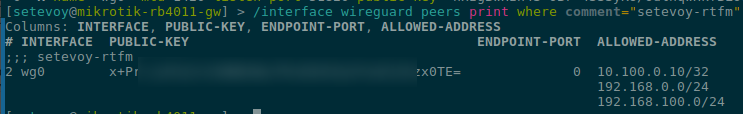 /interface wireguard peers add interface=wg0 public-key="x+Pr***0TE=" allowed-address=10.100.0.10/32,192.168.0.0/24,192.168.100.0/24 comment=setevoy-rtfm