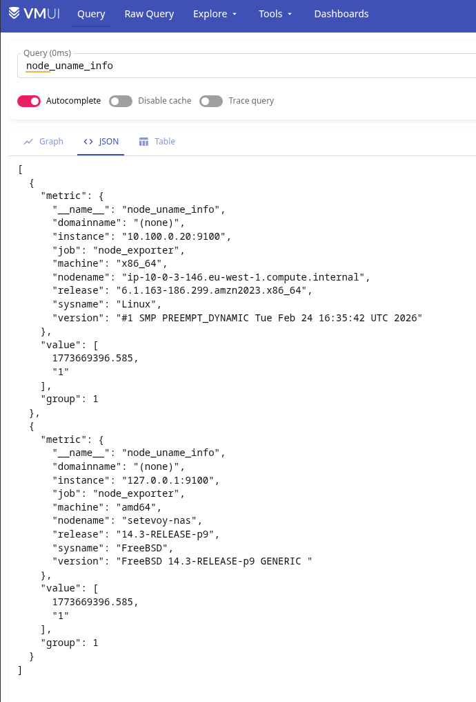 Перевіряємо в VictoriaMetrics через метрику node_uname_info – маємо бачити обидва хости: