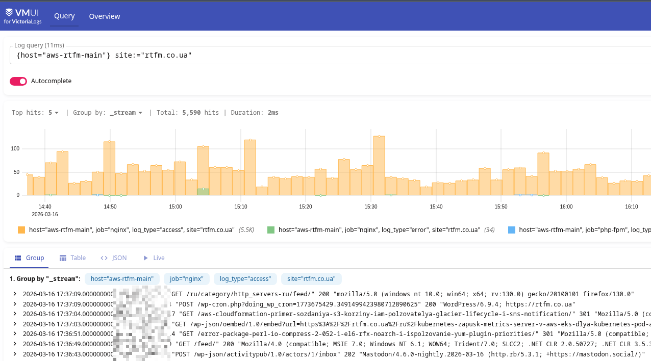 Для логів поки взяв Fluent Bit, який писатиме до VictoriaLogs. Взагалі, пізніше для збору логів спробую vlagent, зараз робив “швиденько” – тому взяв те, що в мене вже працює на FreeBSD/NAS.