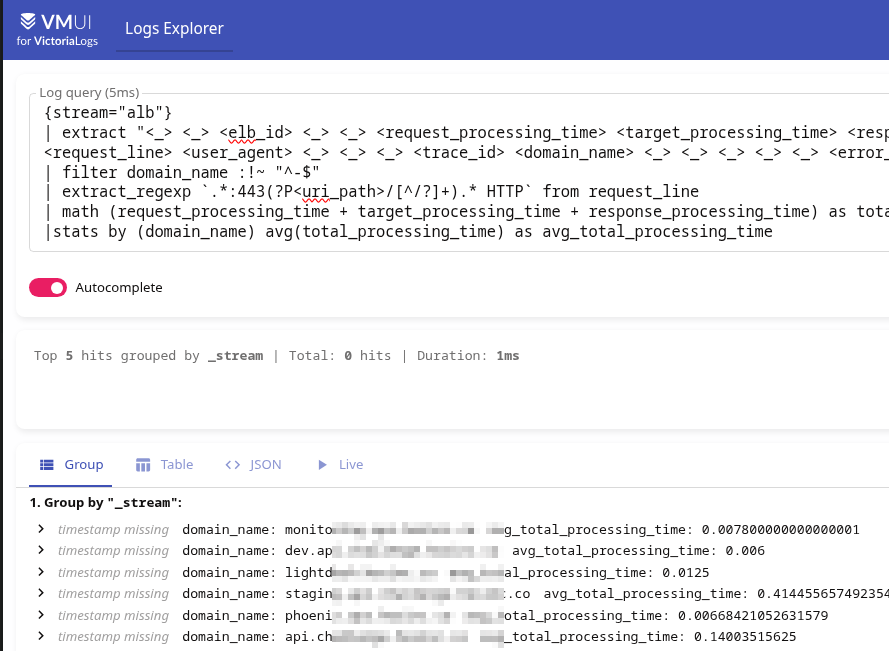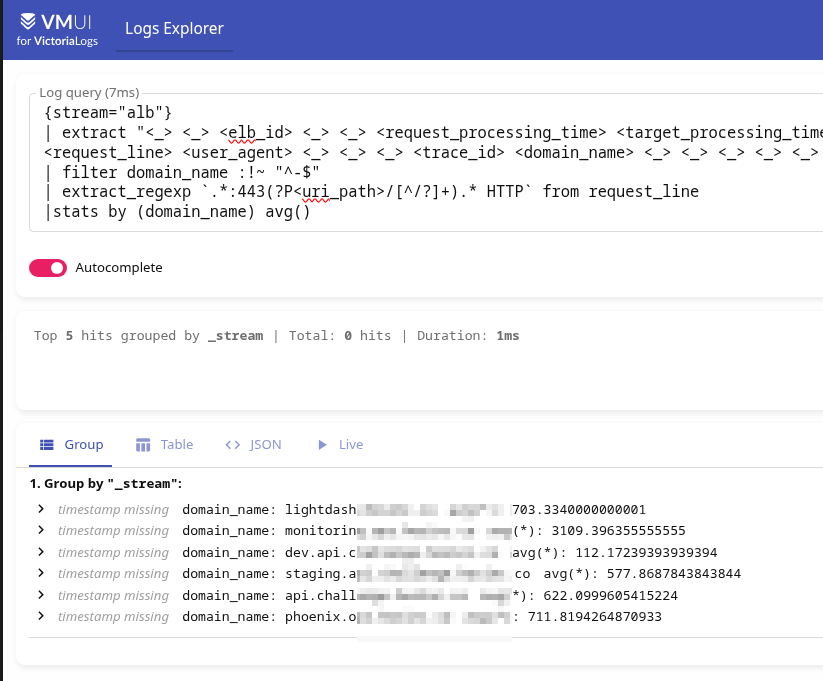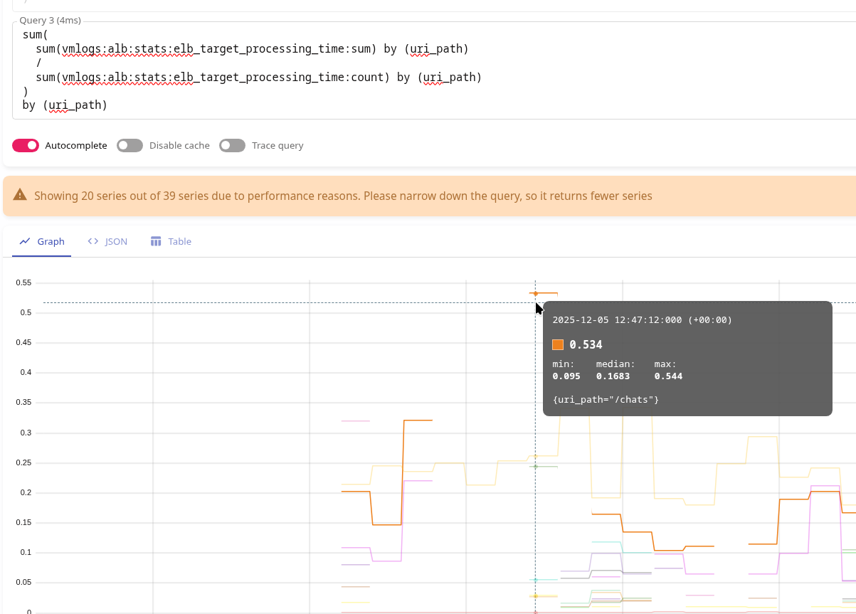 А аби отримати середній загальний час відповіді по всьому лоад-балансеру – можемо або використати метрики vmlogs:alb:stats:elb_target_processing_time:sum і vmlogs:alb:stats:elb_target_processing_time:count так: