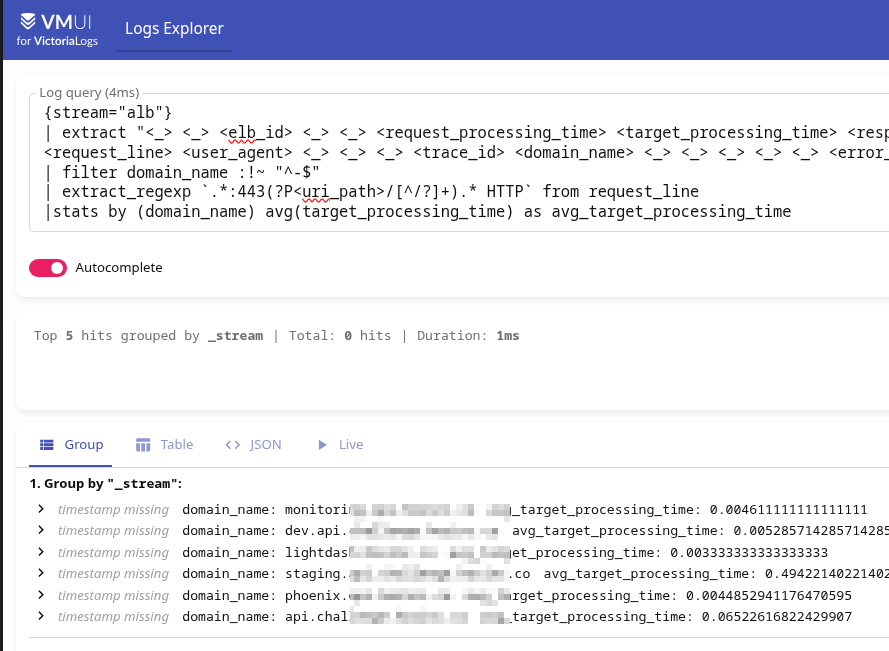 VictoriaLogs LogsQL ALB logs parsing