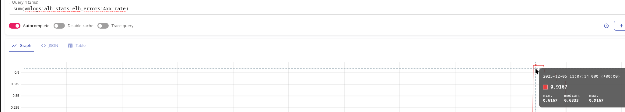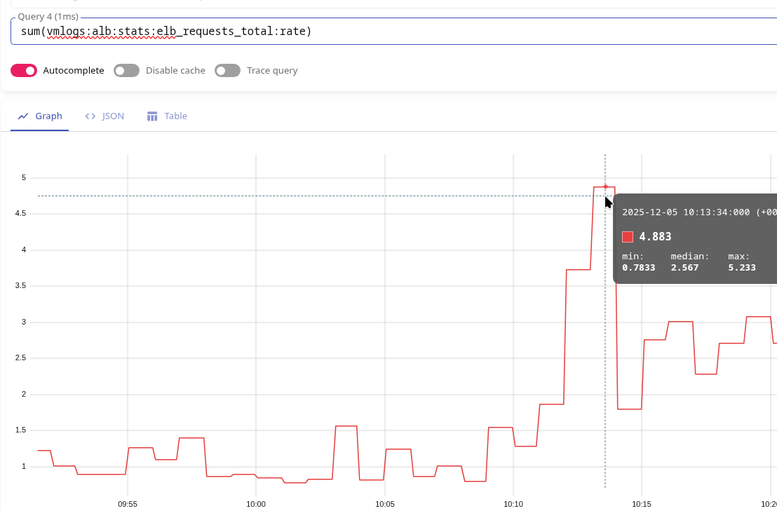 Замість vmlogs:alb:stats:elb_target_processing_time:count можна було б взяти vmlogs:alb:stats:elb_requests_total:count, яку ми робили вище – але в метриках target_processing_time ми прибираємо значення “-1”, яке буває в target_processing_time якщо підключення розірване чи завершилось помилкою, а в vmlogs:alb:stats:elb_requests_total:count у нас всі реквести без виключення.