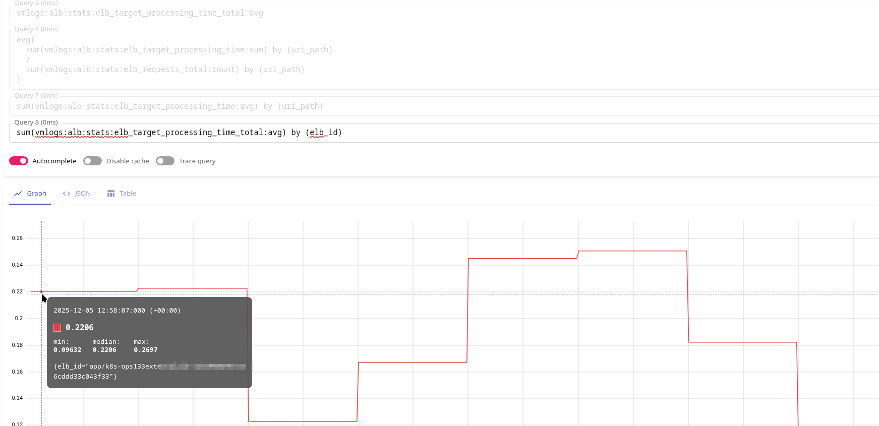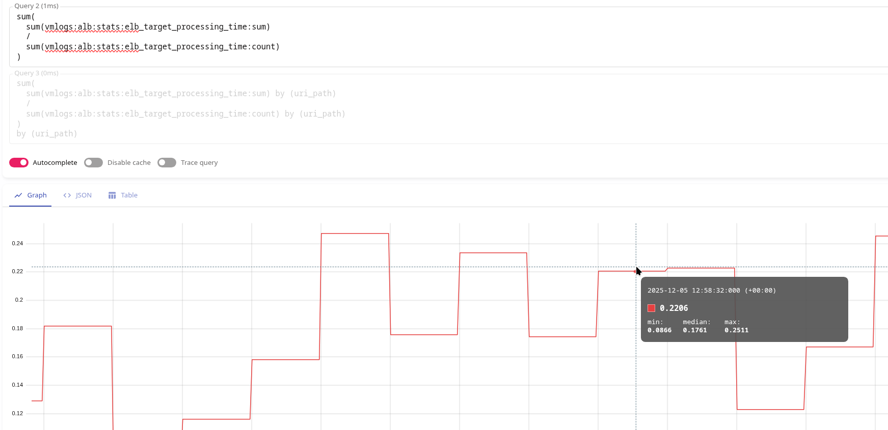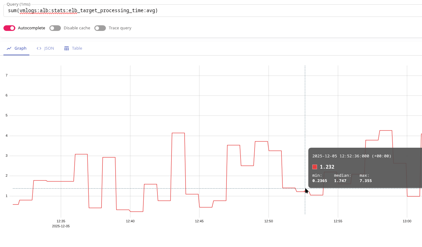 Якщо ж ми будемо рахувати як sum(vmlogs:alb:stats:elb_target_processing_time:avg) – то для тої ж пари: