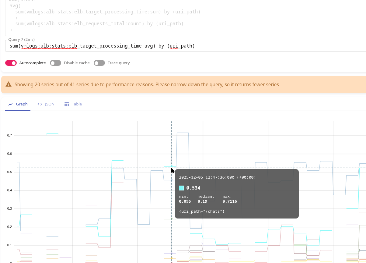 vmlogs:alb:stats:elb_target_processing_time:avg{uri_path="/uri-1"}== 0.1 secvmlogs:alb:stats:elb_target_processing_time:avg{uri_path="/uri-2"}== 2 sec